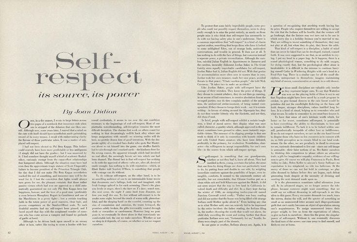 Joan Didion wrote about this important idea in her 1961 Vogue essay entitled ‘Self Respect, Its Source, Its Power’, where she presented self-respect as “a discipline, a habit of mind that can never be faked but can be developed, trained, coaxed forth.”